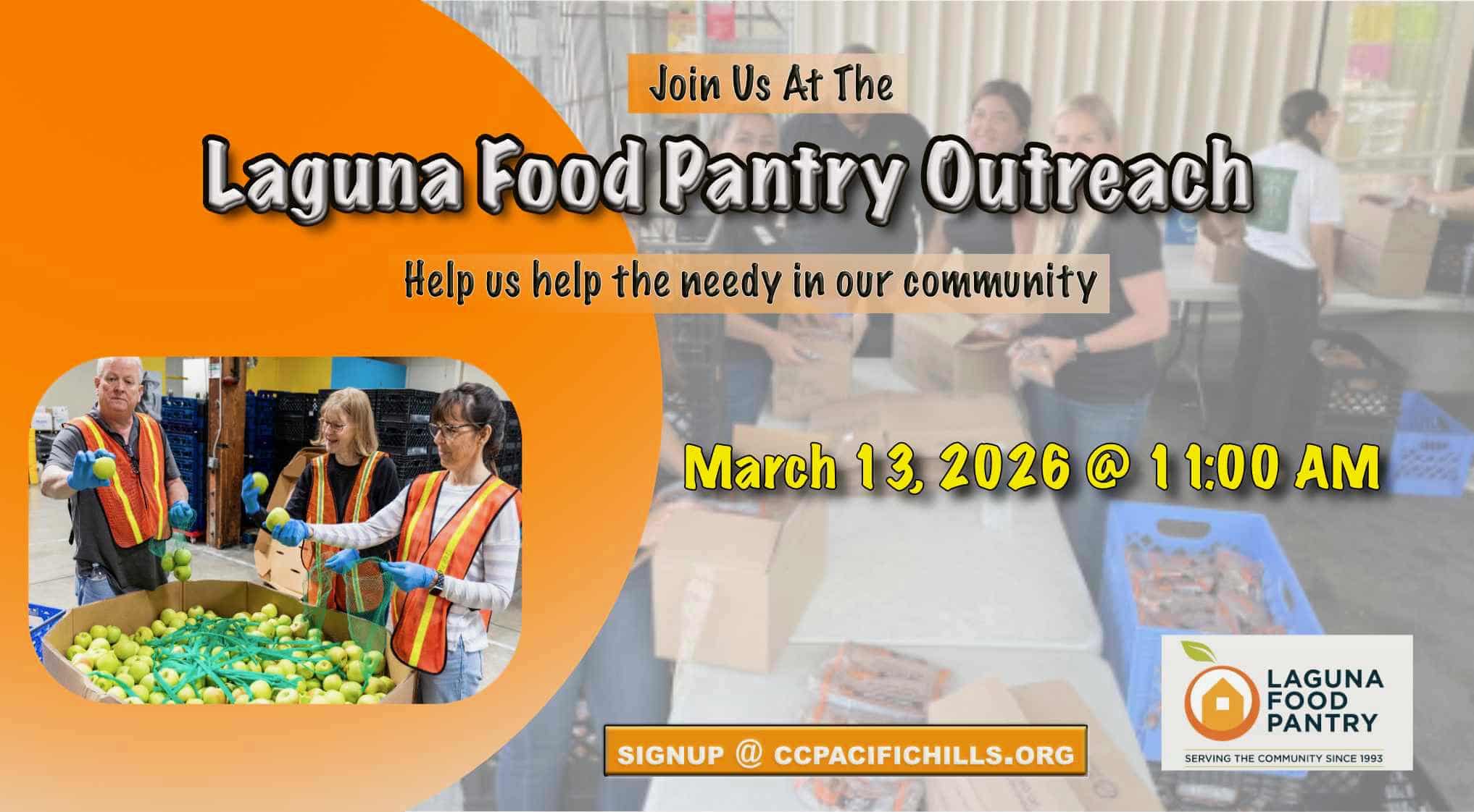 Join us on March 13, at 11:00 AM, as we serve in the Laguna Food Pantry and help bring meals to those who are in need. Your time serving with us, helps ensure fresh, nutritious groceries reach families, seniors, and children facing food insecurity.